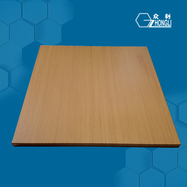 仿木紋鋁蜂窩板由鋁蜂窩板和木紋皮通過熱轉印、滾涂和覆膜等工藝將木紋貼圖轉到鋁蜂窩板上。木紋貼圖可分為平面木紋貼圖和3D木紋貼圖,木紋紋理清晰,效果逼真。木紋鋁蜂窩板具有實木紋路的同時,又具有實現無法比擬的優點,其質量的約211kg/m3,是建筑石膏的1/13,普通水泥的1/15,普通蜂窩板的1/2,不足木材的1/2。以18mm厚的木紋鋁蜂窩板為例,面密度僅為3.8kg/m2;比抗彎剛度(抗彎剛度與體積密度的比值)大,18mm厚的防火蜂窩板的抗彎能力相當于4mm厚的鋁板平面壓縮強度大,能抗柔性沖擊。鋁峰窩板質量輕、韌性好、強度高、隔音隔熱性能好,是大型工程天花吊頂的理想板材選擇,并且鋁蜂窩板安裝方法多樣化,可以進行沉重天花設計,可以上人進行維修。